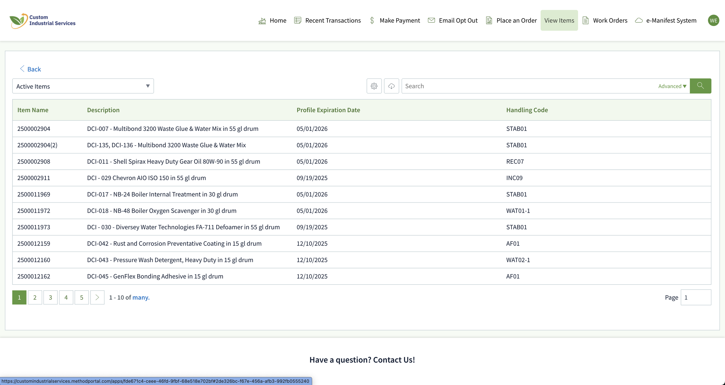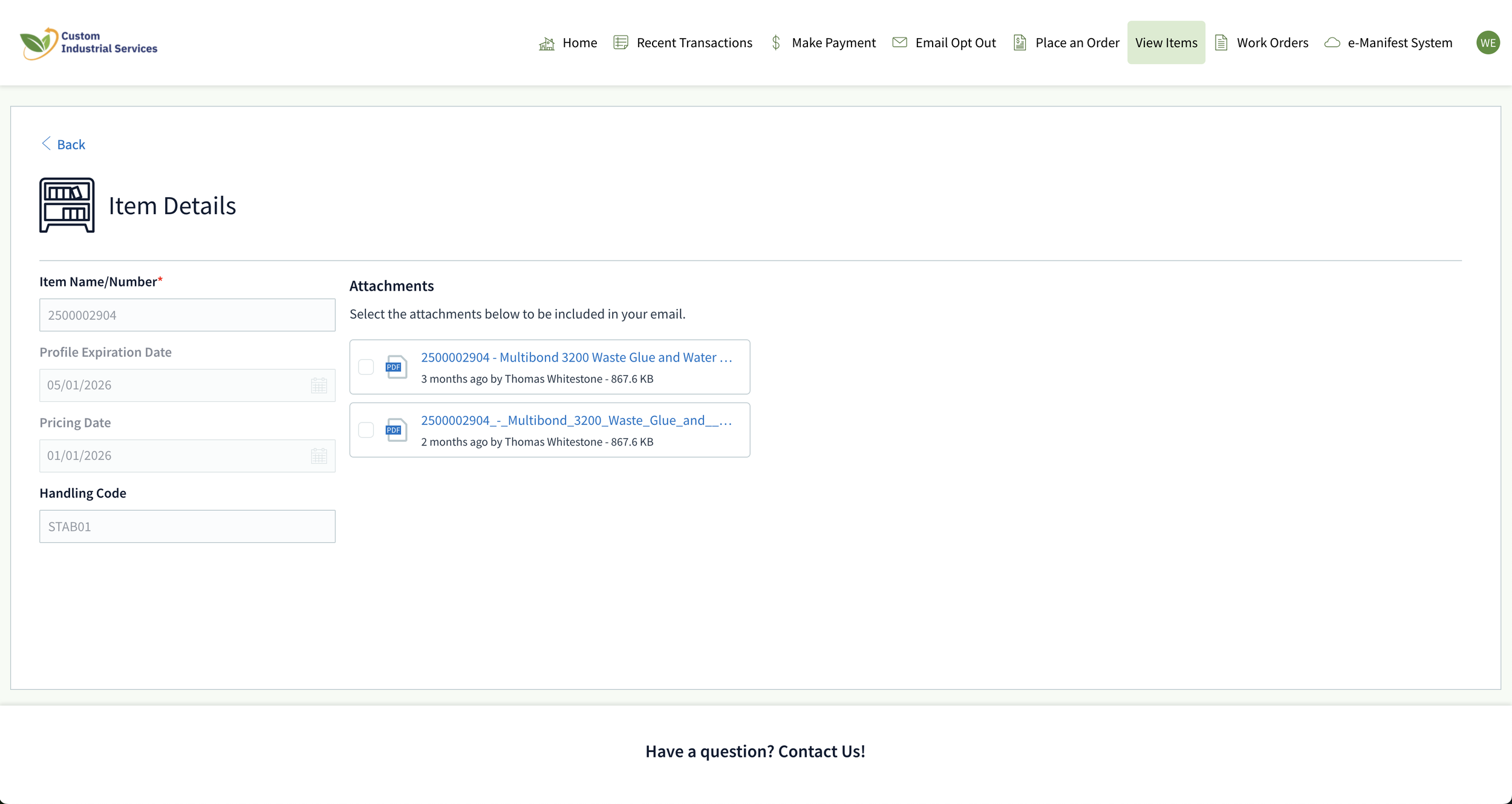 This is 'View Items' screen. Every waste profile we handle for you is listed here, along with their expiration date and waste process code. No more working off outdated spreadsheets. Need paperwork for your records? Click any item.