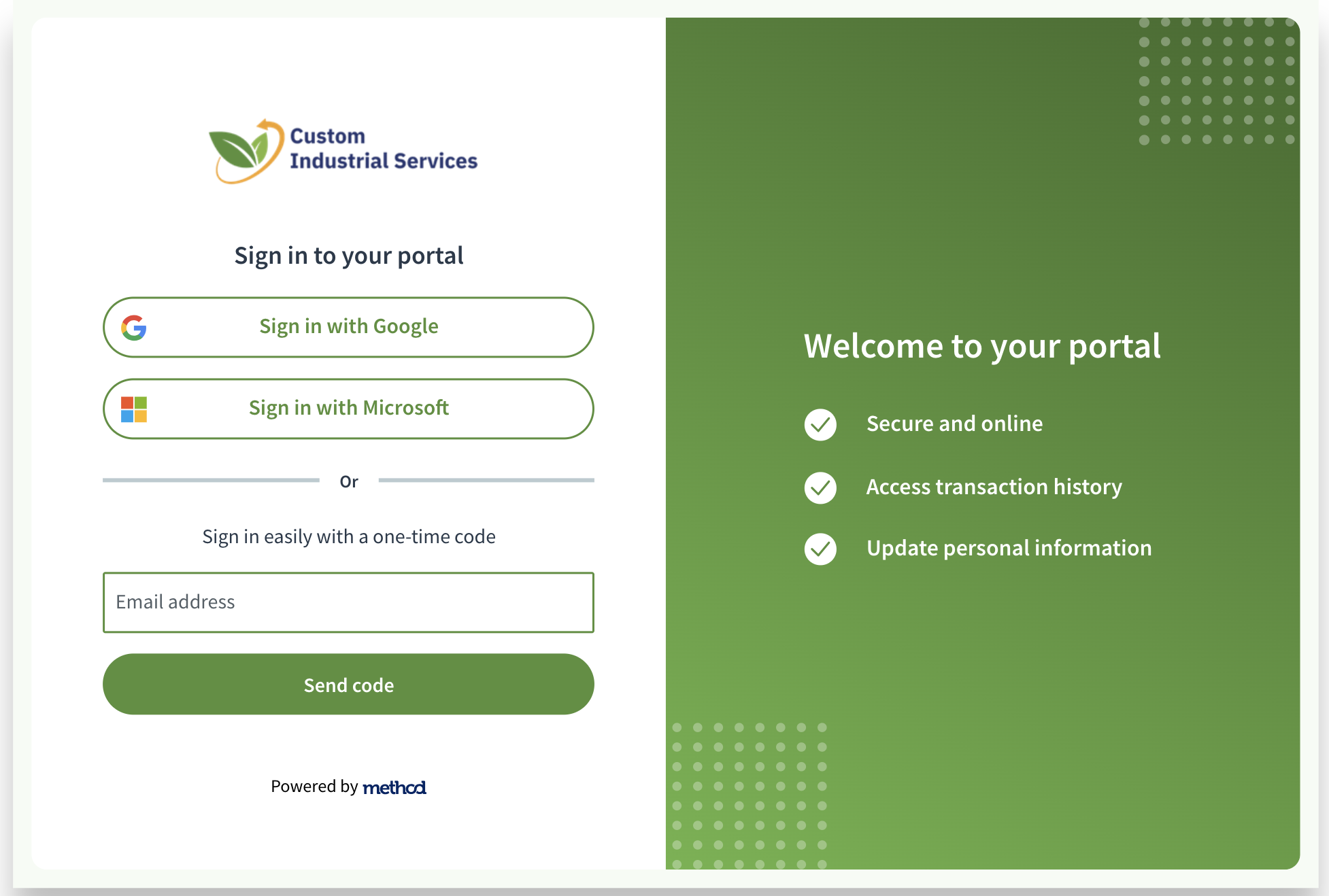 Use your existing Google or Microsoft business account for single sign-on, or enter your email for a secure one-time code.