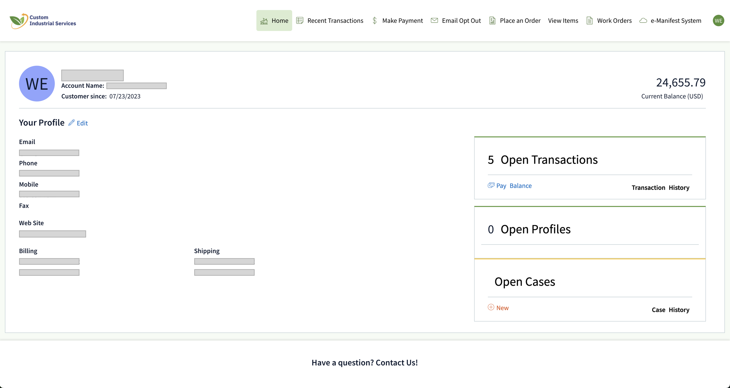 This is the 'Home' screen. You’ll see your current balance at a glance. If you have a question or a specific issue, look at the Open Cases section on the bottom right. Click 'New' to start a support case, create a new waste stream, or make changes to an existing one.